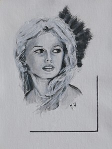 2022vrouwenportret kunstwerk geschilderd op paneel in zwartwit.