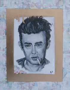2021James Dean op doek met geschilderde goudenlijst op gewit gerecycled Donald Duck papier. Op hout gespannen canvas doek eerst een rand gewit gerecycled Donald Duck papier verwerkt, vervolgens een goudenlijst geschilderd en daarbinnen het portret.