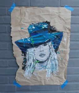 2020Acryl op canvas, Dame met hoed, 18 x 24 cm.