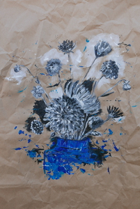 2021zwart wit bloemen in blauwe vaas, hedendaags modern streetart stijl.