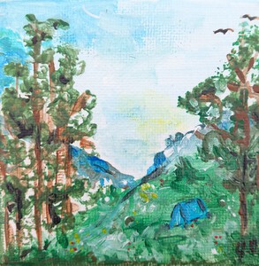 2024mini schilderij 10 x 10 cm natuur, bergen, bos, tent