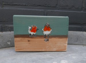 2021Stuk afvalhout beschilderd met roodborstjes, Voor- en achterkant zijn beschilderd. Ene kant twee vogels, andere kant 1 vogel.